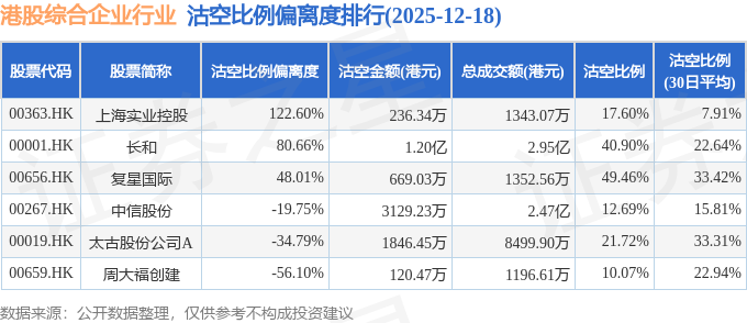 证券之星消息,12月18日港交所披露数据显示,当日港股综合企业行业的21只个股中有6只被沽空,总沽空股数为690.95万股,总沽空金额为1.8亿元(港元),而当日综合企业行业的总成交金额为6.73亿元(港元),沽空比例为26.81%。当日综合企业行业总体跌0.41%。