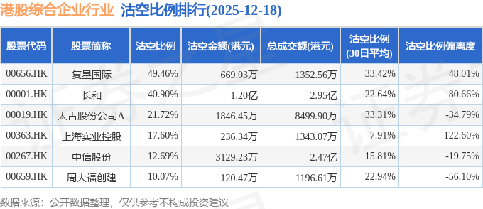 从沽空比例来看,复星国际、长和、太古股份公司A沽空比例位居行业前三,分别为49.46%、40.9%、21.72%。