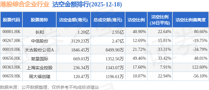 从沽空金额来看,长和、中信股份、太古股份公司A沽空金额位居行业前三,分别为1.2亿港元、3129.23万港元、1846.45万港元。