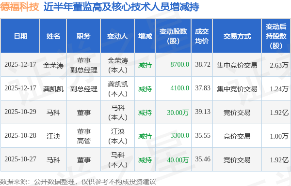 德福科技近半年内的董监高及核心技术人员增减持详情如下:
