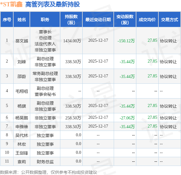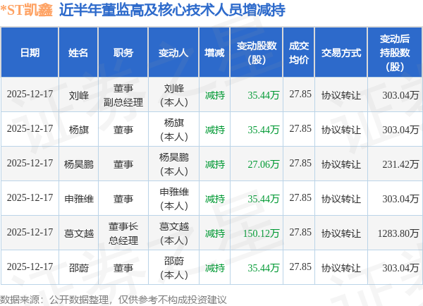 *ST凯鑫近半年内的董监高及核心技术人员增减持详情如下: