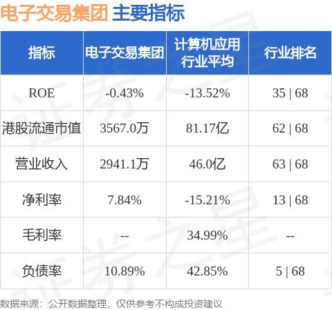 电子交易集团港股市值3567万港元,在计算机应用行业中排名第62。主要指标见下表: