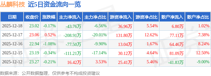 证券之星消息,截至2025年12月18日收盘,丛麟科技(688370)报收于23.02元,下跌0.17%,换手率0.66%,成交量2897.0手,成交额667.46万元。
