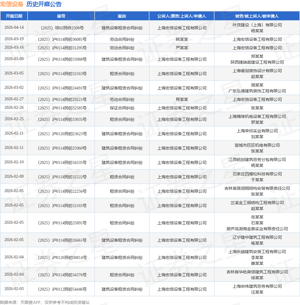 案号:(2025)沪02民终14230号根据统计,近一年内以上海宏信设备工程有限公司为当事人的历史开庭公告有2420则,其中案由为“建筑设备租赁合同纠纷”的公告以1738则居首,其次为“租赁合同纠纷”有479则,“租赁合同”有49则。历史开庭公告(前20条)如下: