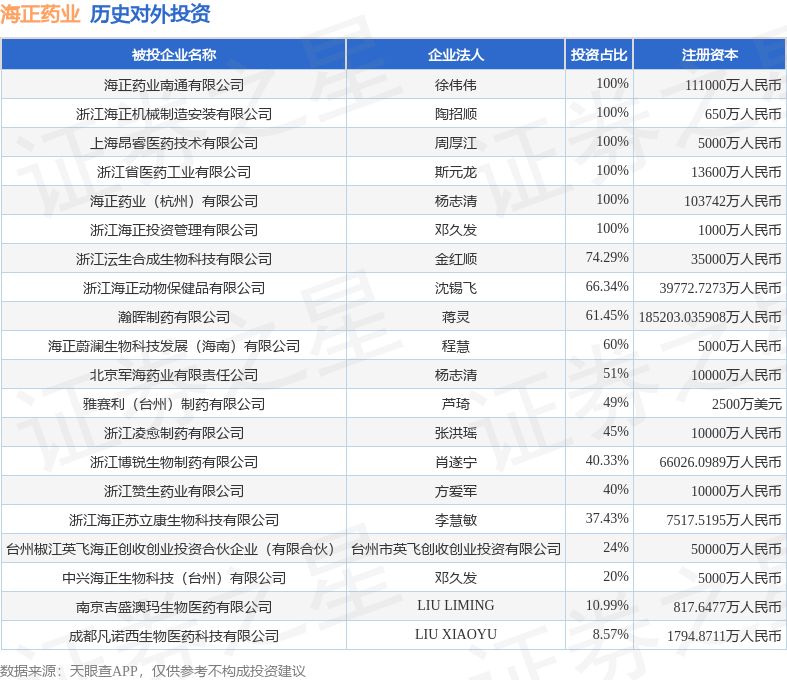 通过天眼查大数据分析,浙江海正药业股份有限公司共对外投资了26家企业,参与招投标项目5318次;财产线索方面有商标信息227条,专利信息498条,著作权信息1条;此外企业还拥有行政许可411个。据2024年报数据,海正药业长期股权投资14.3亿元,同比增2.55%。
