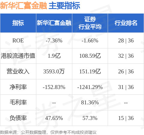 新华汇富金融港股市值1.9亿港元,在证券行业中排名第32。主要指标见下表: