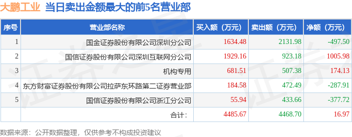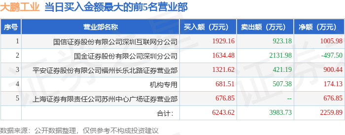 12月19日大鹏工业(920091)龙虎榜数据:机构净买入174.13万元