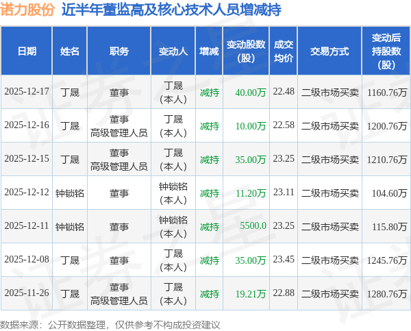 证券之星消息,根据12月19日市场公开信息、上市公司公告及交易所披露数据整理,诺力股份(603611)最新董监高及相关人员股份变动情况:2025年12月12日至2025年12月17日公司董事丁晟、董事,高级管理人员丁晟、董事钟锁铭共减持公司股份96.2万股,占公司总股本为0.3735%。变动期间公司股价下跌1.69%,12月17日当日收盘报22.66元。