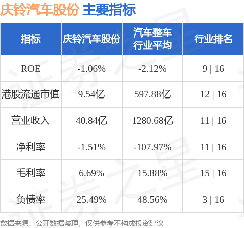庆铃汽车股份港股市值9.54亿港元,在汽车整车行业中排名第12。主要指标见下表: