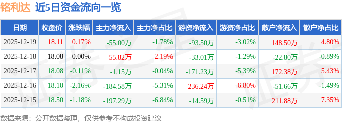 证券之星消息,截至2025年12月19日收盘,铭利达(301268)报收于18.11元,上涨0.17%,换手率0.49%,成交量1.69万手,成交额3091.17万元。
