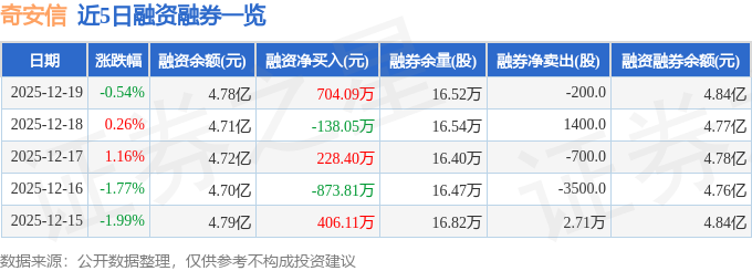 奇安信融资融券信息显示,融资方面,当日融资买入1440.23万元,融资偿还736.14万元,融资净买入704.09万元。融券方面,融券卖出0.0股,融券偿还200.0股,融券余量16.52万股,融券余额573.17万元。融资融券余额4.84亿元。