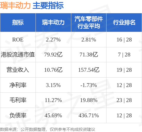 瑞丰动力港股市值79.92亿港元,在汽车零部件行业中排名第7。主要指标见下表: