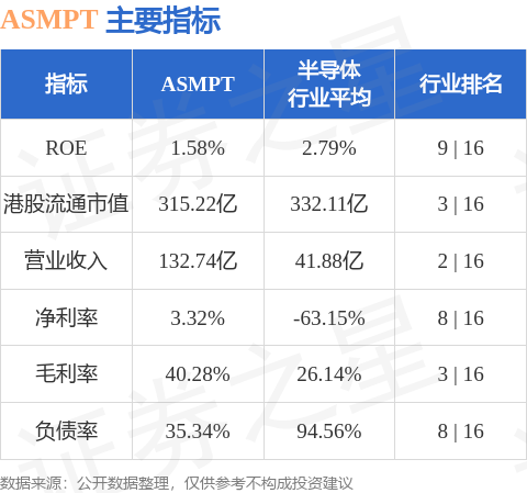 ASMPT港股市值315.22亿港元,在半导体行业中排名第3。主要指标见下表: