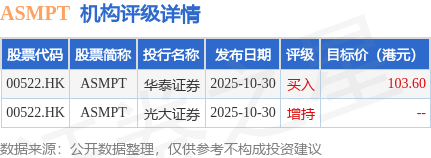 投行对该股的评级以增持为主,近90天内共有1家投行给出增持评级,近90天的目标均价为103.6港元。华泰证券最新一份研报给予ASMPT买入评级,目标价103.6港元。