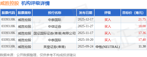 投行对该股的评级以买入为主,近90天内共有4家投行给出买入评级,近90天的目标均价为17.16港元。中泰国际最新一份研报给予威胜控股买入评级,目标价21.75港元。