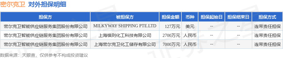 密尔克卫12月19日披露3笔对外担保,被担保公司3家。对外担保明细如下表: