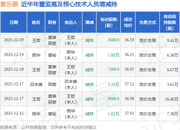 证券之星消息,根据12月22日市场公开信息、上市公司公告及交易所披露数据整理,富乐德(301297)最新董监高及相关人员股份变动情况:2025年12月19日公司董事,高管王哲、董秘颜华共减持公司股份1.26万股,占公司总股本为0.0016%。变动期间公司股价下跌1.04%,12月19日当日收盘报36.17元。