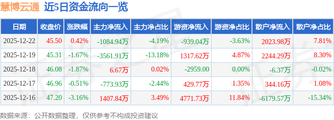 证券之星消息,截至2025年12月22日收盘,慧博云通(301316)报收于45.5元,上涨0.42%,换手率1.41%,成交量5.64万手,成交额2.59亿元。