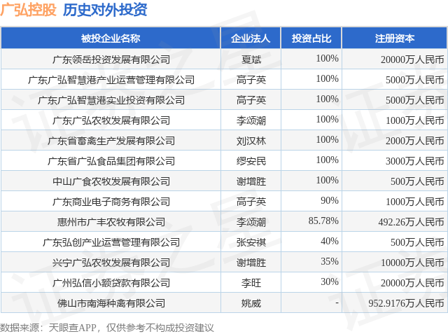 证券之星消息,根据天眼查APP显示,广弘控股(000529.SZ)新增一起对外投资事件,被投资公司为佛山市南海种禽有限公司,法定代表人姚威,投资占比为-。该公司从事畜牧业,注册资本为952.9176万人民币。目前,广弘控股共存在对外投资13项,详见下表: