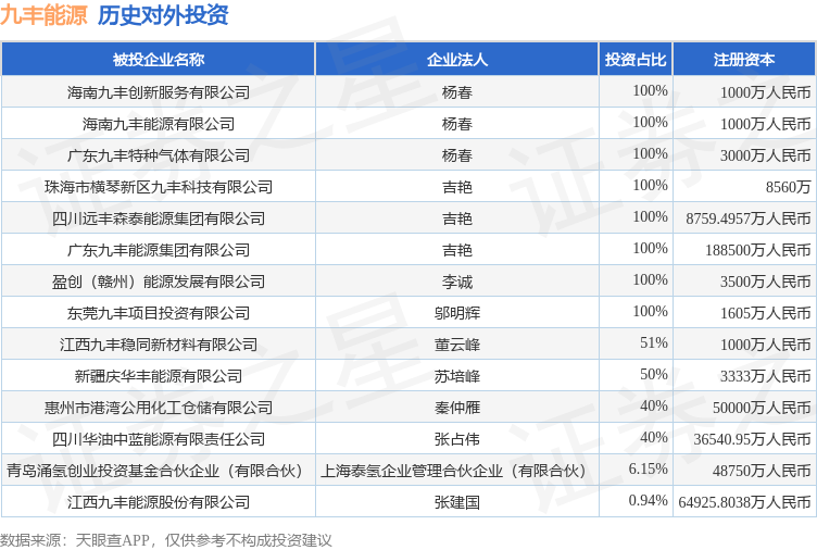 证券之星消息,根据天眼查APP显示,九丰能源(605090.SH)新增一起对外投资事件,被投资公司为新疆庆华丰能源有限公司,法定代表人苏培峰,投资占比为50%。该公司从事燃气生产和供应业,注册资本为3333万人民币。目前,九丰能源共存在对外投资14项,详见下表:
