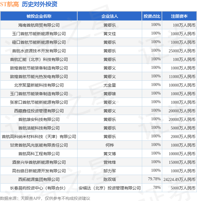 证券之星消息,根据天眼查APP显示,ST航高(002665.SZ)新增一起对外投资事件,被投资公司为海南首航商贸有限公司,法定代表人黄卿乐,投资占比为100%。该公司从事批发业,注册资本为100万人民币。目前,ST航高共存在对外投资31项,投资占比前20的项目见下表: