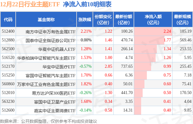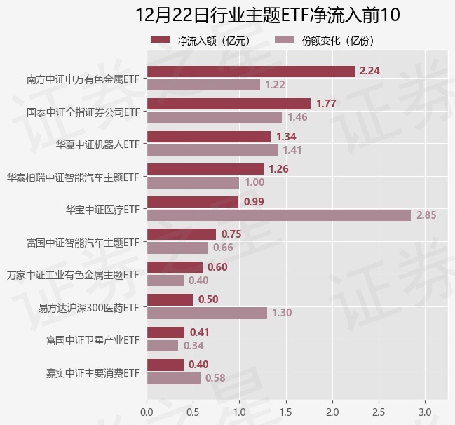 当日有48只行业主题ETF基金出现资金净流入,其中净流入排首位的是南方中证申万有色金属ETF(512400),份额增加了1.22亿份,净流入额为2.24亿元。