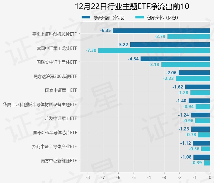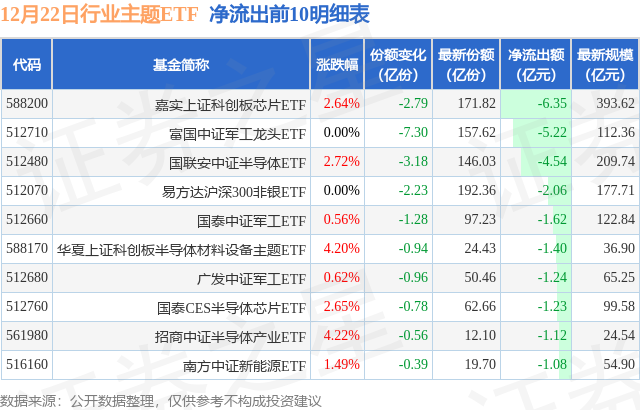 当日有162只行业主题ETF基金出现资金净流出,其中净流出排首位的是嘉实上证科创板芯片ETF(588200),份额减少了2.79亿份,净流出额为6.35亿元。