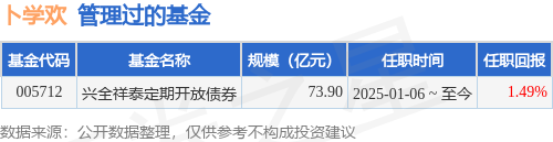 卜学欢先生:中国国籍,硕士研究生。2017年7月起至今就职于兴证全球基金管理有限公司,历任固定收益部债券研究员、交易部债券交易员、固定收益部合规管理员、固定收益部基金经理助理。2025年1月6日起任兴全祥泰定期开放债券型发起式证券投资基金基金经理。