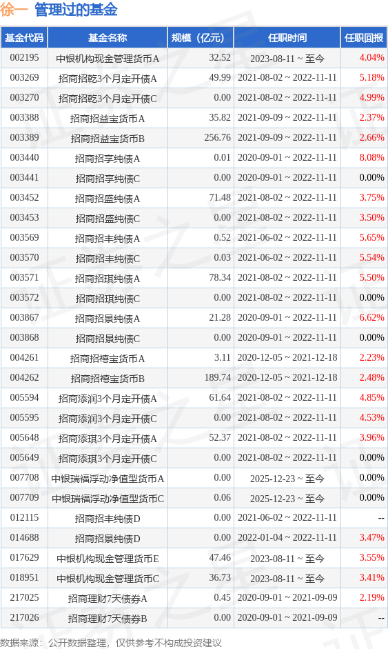 徐一女士:中国,研究生、硕士。2017年加入招商基金管理有限公司,任固定收益投资部研究员。2020年9月1日至2022年11月11日任招商招景纯债债券型证券投资基金基金经理。曾任招商理财7天债券型证券投资基金基金经理。2020年9月1日至2022年11月11日任招商招享纯债债券型证券投资基金基金经理。2021年6月2日至2022年11月11日任招商招丰纯债债券型证券投资基金基金经理。2021年8月2日至2022年11月11日担任招商添琪3个月定期开放债券型发起式证券投资基金基金经理。2021年8月2日至2022年11月11日任招商招琪纯债债券型证券投资基金基金经理。2021年8月2日至2022年11月11日任招商招乾3个月定期开放债券型发起式证券投资基金基金经理。曾任招商招禧宝货币市场基金、招商招盛纯债债券型证券投资基金、招商招益宝货币市场基金、招商添润3个月定期开放债券型发起式证券投资基金基金经理。2022年加入中银基金管理有限公司,曾任风控中台。2023年8月11日担任中银机构现金管理货币市场基金基金经理。2025年12月23日担任中银瑞福浮动净值型发起式货币市场基金基金经理。