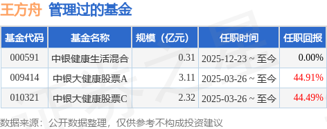 王方舟先生:中国国籍,研究生、硕士,2017年加入中银基金管理有限公司,曾任研究员、基金经理助理。2025年3月26日起任中银大健康股票型证券投资基金基金经理。2025年12月23日起担任中银健康生活混合型证券投资基金的基金经理。