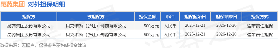 昆药集团12月22日披露2笔对外担保,被担保方为贝克诺顿(浙江)制药有限公司。对外担保明细如下表:
