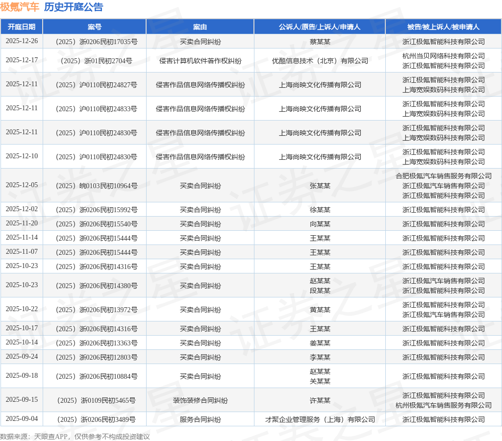 案号:(2025)浙0206民初17035号根据统计,近一年内以浙江极氪智能科技有限公司为当事人的历史开庭公告有55则,其中案由为“买卖合同纠纷”的公告以32则居首,其次为“装饰装修合同纠纷”有7则,“侵害作品信息网络传播权纠纷”有4则。历史开庭公告(前20条)如下: