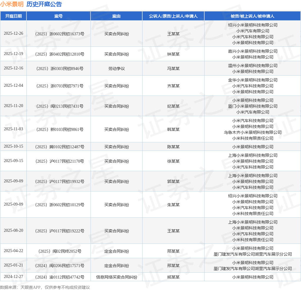 案号:(2025)浙0602民初16373号根据统计,近一年内以小米景明科技有限公司为当事人的历史开庭公告有14则,其中案由为“买卖合同纠纷”的公告以10则居首,其次为“定金合同纠纷”有2则,“信息网络买卖合同纠纷”有1则。历史开庭公告如下: