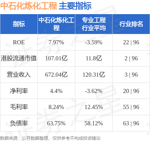 中石化炼化工程港股市值107.01亿港元,在专业工程行业中排名第2。主要指标见下表: