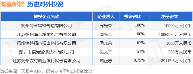 通过天眼查大数据分析,扬州海昌新材股份有限公司共对外投资了7家企业,参与招投标项目19次;财产线索方面有商标信息3条,专利信息99条;此外企业还拥有行政许可21个。