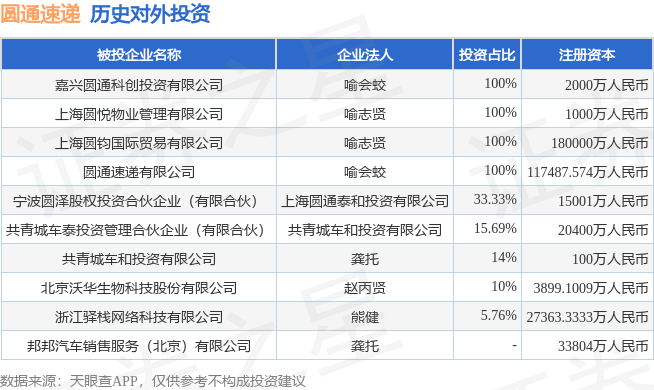 通过天眼查大数据分析,圆通速递股份有限公司共对外投资了13家企业,参与招投标项目16次;财产线索方面有商标信息13条,专利信息13条,著作权信息1条;此外企业还拥有行政许可3个。据2024年报数据,圆通速递商誉3.49亿元,同比增1.97%。长期股权投资3.17亿元,同比减38.97%。