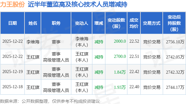 力王股份近半年内的董监高及核心技术人员增减持详情如下: