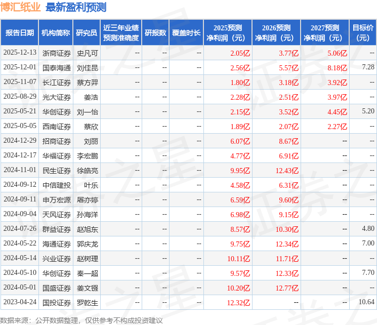 公司作为国内白卡纸头部企业,APP全方位赋能下优势显著。随着下游需求好转,叠加高市场集中度下的议价权,白卡纸行业有望周期底部反转,叠加公司新增产能释放,公司盈利有望迎来底部反转。我们预计公司2025-2027年营收分别为183.56/203.83/221.95亿元,分别同比增长-3%/11%/8.9%;归母净利润分别为1.82/4.07/6.52亿元,分别同比增长3.7%/123%/60.2%,EPS分别为0.14/0.3/0.49元,截至2025年12月19日,对应PE分别为45.00/20.18/12.59倍。首次覆盖,给予“买入”评级。