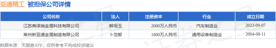 亚通精工12月23日披露2笔对外担保,被担保公司2家。对外担保明细如下表: