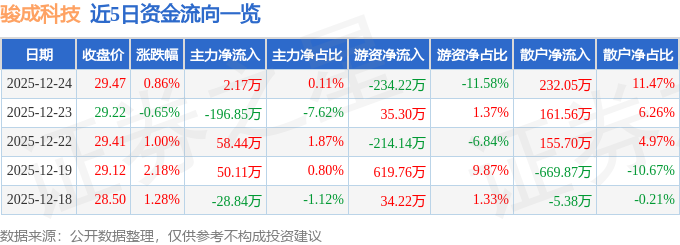 证券之星消息,截至2025年12月24日收盘,骏成科技(301106)报收于29.47元,上涨0.86%,换手率0.67%,成交量6870.0手,成交额2023.06万元。