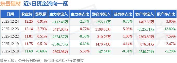 证券之星消息,截至2025年12月24日收盘,东岳硅材(300821)报收于12.25元,上涨0.91%,换手率3.36%,成交量40.28万手,成交额4.9亿元。