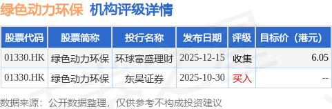 截至2025年12月24日收盘,绿色动力环保(01330.HK)报收于5.32港元,上涨0.19%,成交量10.97万股,成交额58.27万港元。投行对该股的评级以收集为主,近90天内共有1家投行给出收集评级,近90天的目标均价为6.05港元。环球富盛理财最新一份研报给予绿色动力环保收集评级,目标价6.05港元。