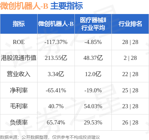 微创机器人-B港股市值213.55亿港元,在医疗器械Ⅱ行业中排名第2。主要指标见下表: