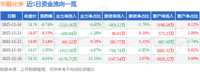 证券之星消息,截至2025年12月24日收盘,华融化学(301256)报收于14.76元,下跌0.74%,换手率5.53%,成交量26.55万手,成交额3.93亿元。