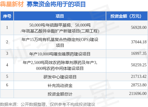 证券之星消息,湖北犇星新材料股份有限公司(简称:犇星新材)拟在上交所主板上市,募资总金额为21.0亿元,保荐机构为国泰君安证券股份有限公司。募集资金拟用于50,000吨/年硫醇甲基锡、50,000吨/年巯基乙酸异辛酯扩产新建项目(二期工程)、年产15万吨有机基复合热稳定剂(OPS)建设项目、年产10,000吨噻虫嗪原药建设项目、年产2,500吨高效农药除草剂原药及年产3,000吨农药中间体建设项目、研发中心建设项目、补充流动资金,详见下表: