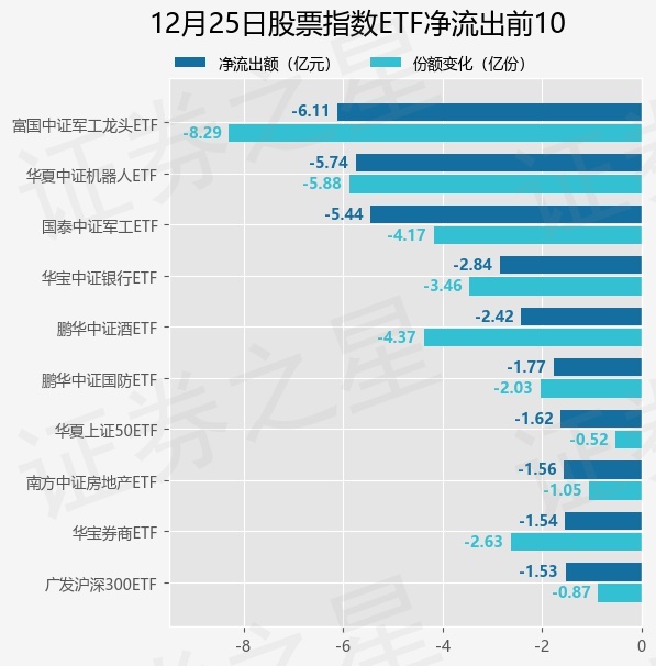 证券之星消息,12月25日,上证指数报收3959.62,上涨0.47%;深圳成指报收13531.41,上涨0.33%;行业主题中,国防军工、轻工制造、机械设备涨幅居前,综合、有色金属、商贸零售领跌。从当日股票型ETF基金的二级市场表现来看,以中证卫星产业、中证全指航空航天、中证军工龙头等指数为跟踪标的的ETF基金领涨,其中广发中证卫星产业ETF、易方达中证卫星产业ETF、富国中证卫星产业ETF分别以5.91%、5.86%、5.82%的涨幅居前三。以中证沪深港黄金产业股票、中证有色金属矿业主题、有色金属等指数为跟踪标的的ETF基金领跌,其中国泰中证沪深港黄金产业股票ETF、永赢中证沪深港黄金产业股票ETF、国泰中证有色金属矿业主题ETF分别以-1.52%、-1.35%、-1.34%的跌幅居前三。