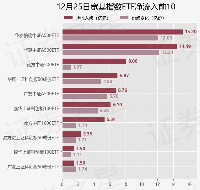 证券之星消息,12月25日宽基指数ETF基金合计资金净流入62.01亿元,近5个交易日累计净流入448.65亿元,5个交易日中出现日合计资金净流入的有5天(ETF资金流向计算公式:(当日ETF场内流通份额-前一交易日ETF场内流通份额)*当日ETF均价,计算结果仅供参考)。