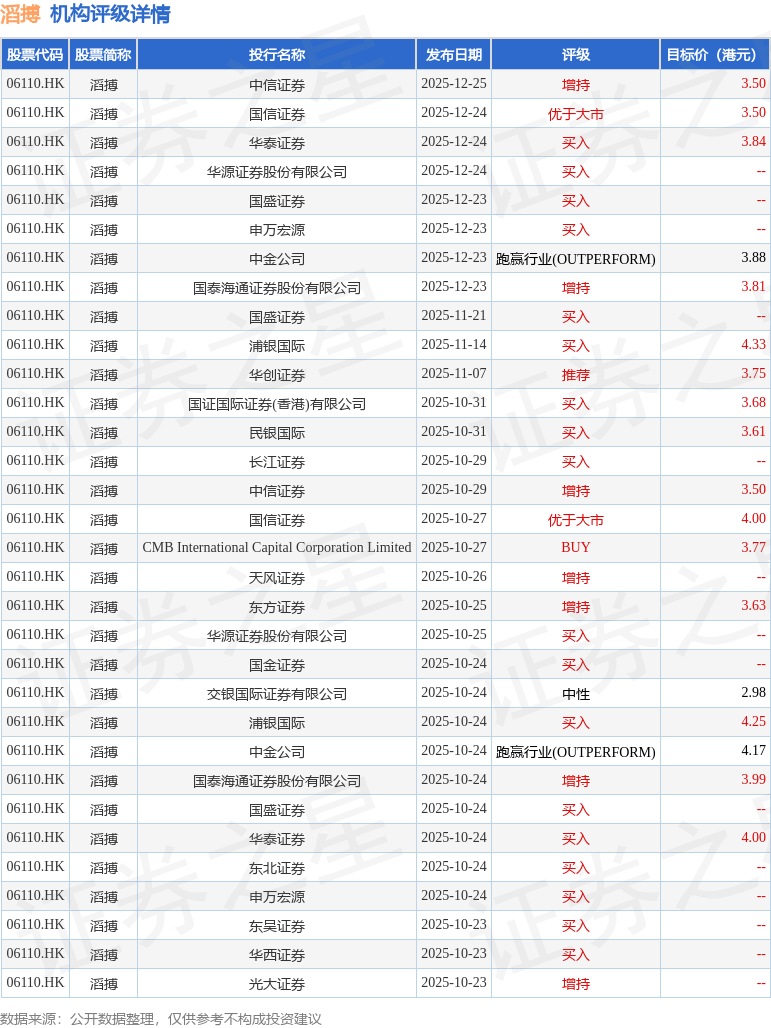投行对该股的评级以买入为主,近90天内共有18家投行给出买入评级,近90天的目标均价为3.79港元。中信证券最新一份研报给予滔搏增持评级,目标价3.5港元。