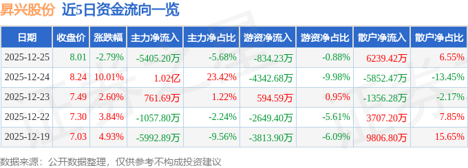 12月25日的资金流向数据方面,主力资金净流出5405.2万元,占总成交额5.68%,游资资金净流出834.23万元,占总成交额0.88%,散户资金净流入6239.42万元,占总成交额6.55%。
