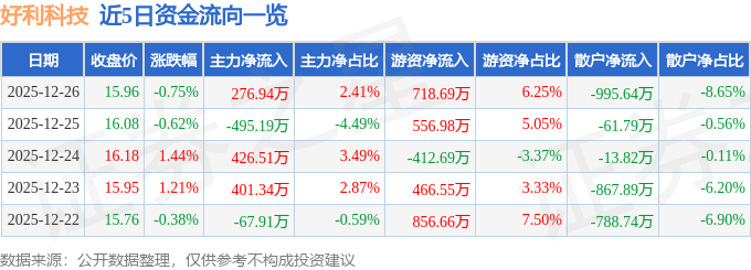 证券之星消息,截至2025年12月26日收盘,好利科技(002729)报收于15.96元,下跌0.75%,换手率4.08%,成交量7.15万手,成交额1.15亿元。